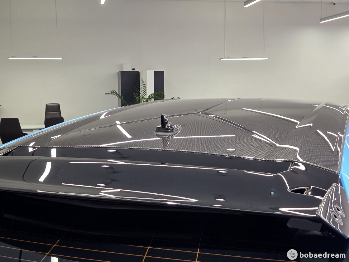 경량 탄소 섬유로 제작됐다. 후드 라인에서부터 프론트 범퍼까지 길게
